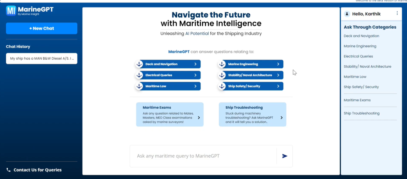 MARINE GPTMARITIME / LOGISTICSThe maritime industry relies on vast regulatory documentation, vessel specifications, and operational manuals spread across thousands of PDFs and legacy systems. Crews and operator...